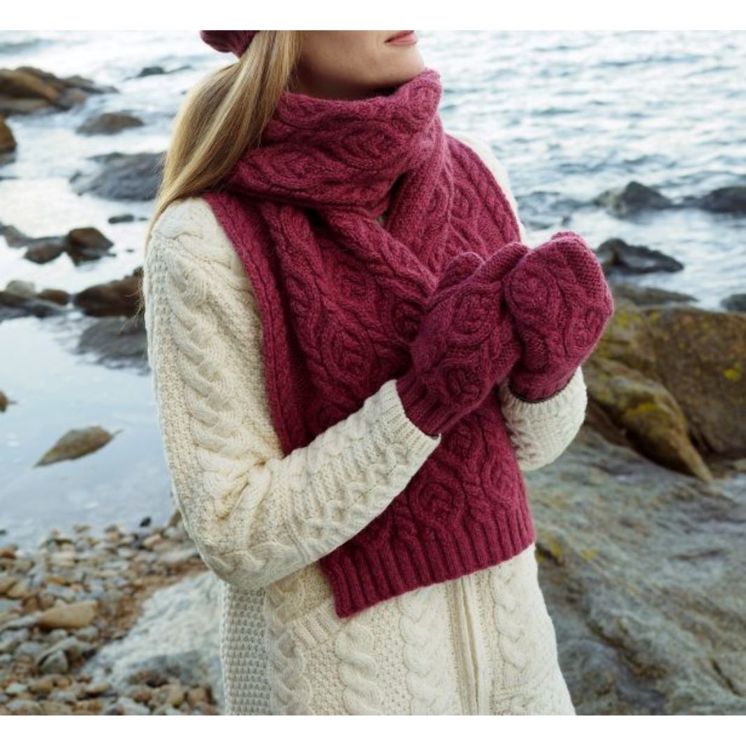 This beautifully cable leaf designed scarf is luxurious soft and is sure to keep you warm and cozy in the winter months. This Aran scarf is knit with the traditional cable knit pattern with leaf design.