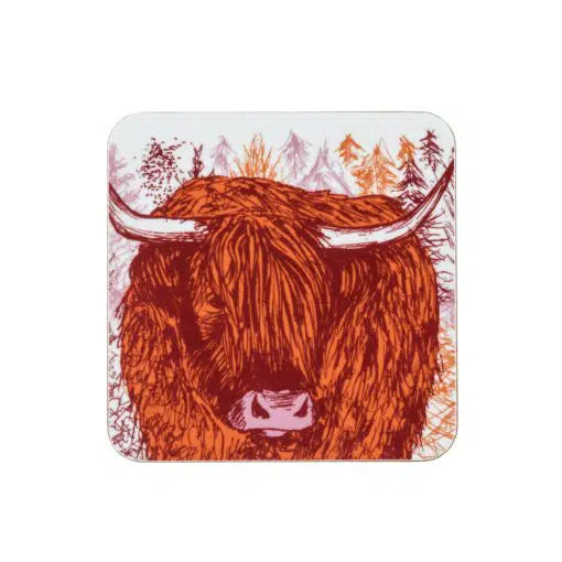 Made in the UK, this highland cow and winter fir trees design has been printed onto eucalyptus board before being sealed with a matt laminate. The base of the coaster is cork so it won’t scratch any surfaces. The coaster is square in size, has rounded corners and measures 9.8cm x 9.8cm.
