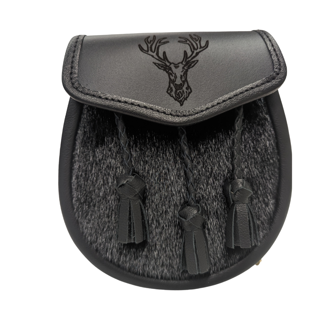 Day Sporran | Black Leather & Black Fur with Braided Tassels and Stag Head Design