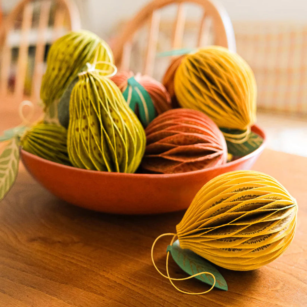 Composed of intricate layers of recycled cotton paper, each decoration unfolds to reveal a three-dimensional honeycomb lemon.