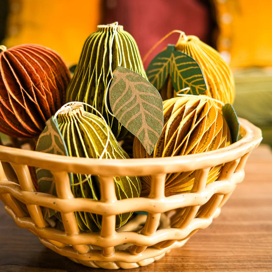 Composed of intricate layers of recycled cotton paper, each decoration unfolds to reveal a three-dimensional honeycomb pear.