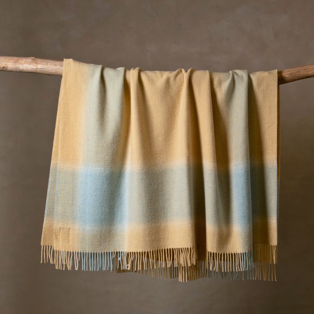 Boasting a soothing yellow background colour with accents of light blue, a delicate diamond design, a brushed finish and elegant fringe, this blanket is incredibly soft and warm.  Crafted with meticulous precision by well-known 6th-generation Irish weavers, Molloy & Sons, this blanket is an ideal present for weddings, birthdays, and anniversaries.