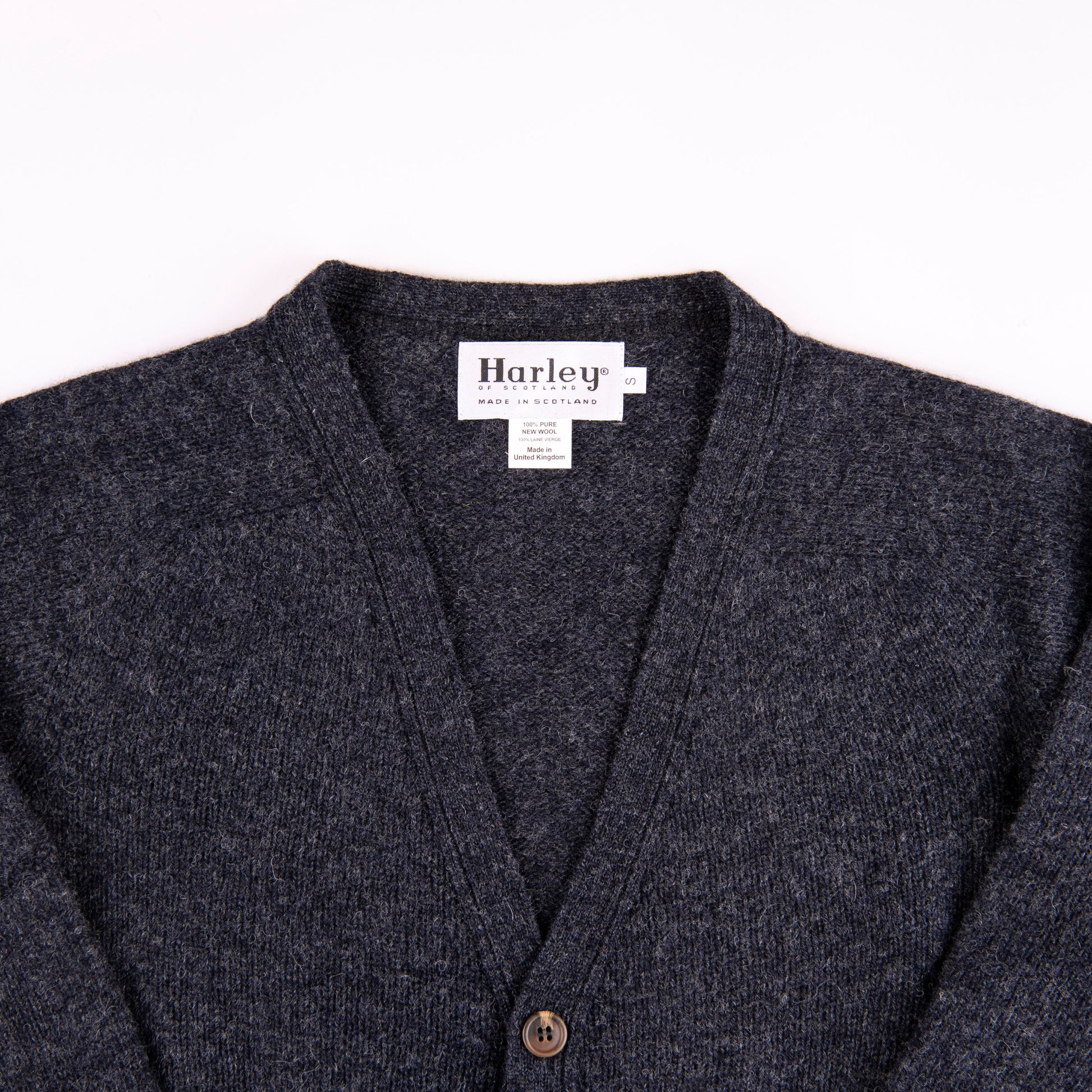 Harley of Scotland's saddle-shoulder Shetland cardigan offers a seam-free homespun construction. Made using a 2-ply Scottish yarn, this sweater is lightweight and comfortable. With a classic V-neck design, this cardigan offers a flattering silhouette in a two-tone charcoal colour. Perfect for layering.