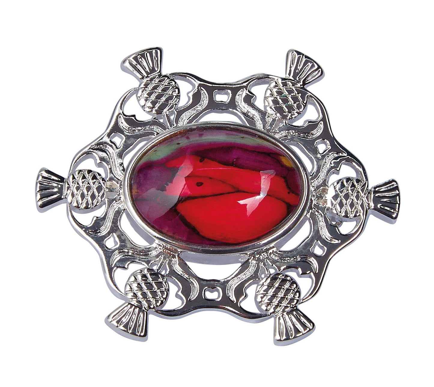 - Silver plated Brooch with six Highland Thistles surrounding inset Heathergem made from the dyed, pressed and lacquered stems of natural heather