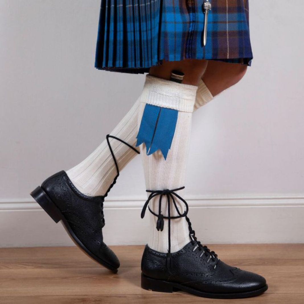 These Garter Flashes are made from Wool Braid. Garter flashes hang below the cuff of your kilt hose (socks) in a matching tartan to your kilt. They are attached to elastic, making for an easy fastening with a hook and clasp, which is hidden by the cuff of your kilt hose. These flashes have two double ribbons (flashes) per garter.