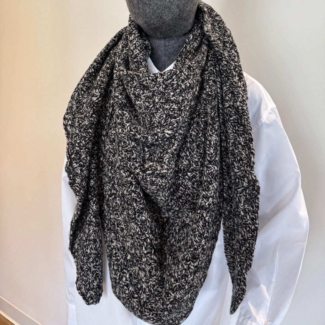 This extra soft McKernan Jynx Scarf is a triangular shawl knitted from 100% virgin wool in a basket stitch.