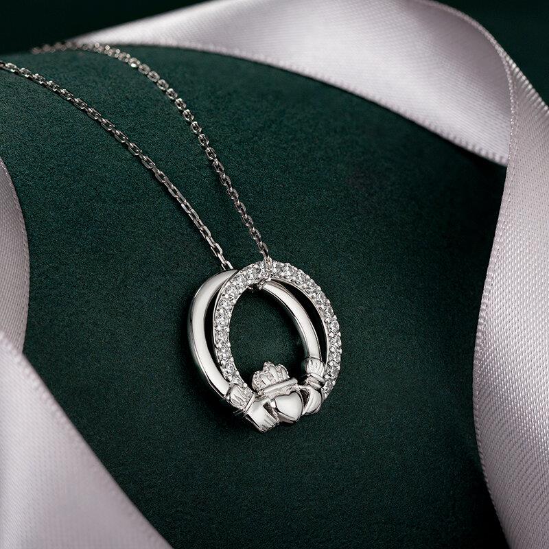 - One circle features the classic Claddagh design which is symbolic of love, friendship and loyalty and the second circle is inlaid with cubic zirconia crystals for added sparkle