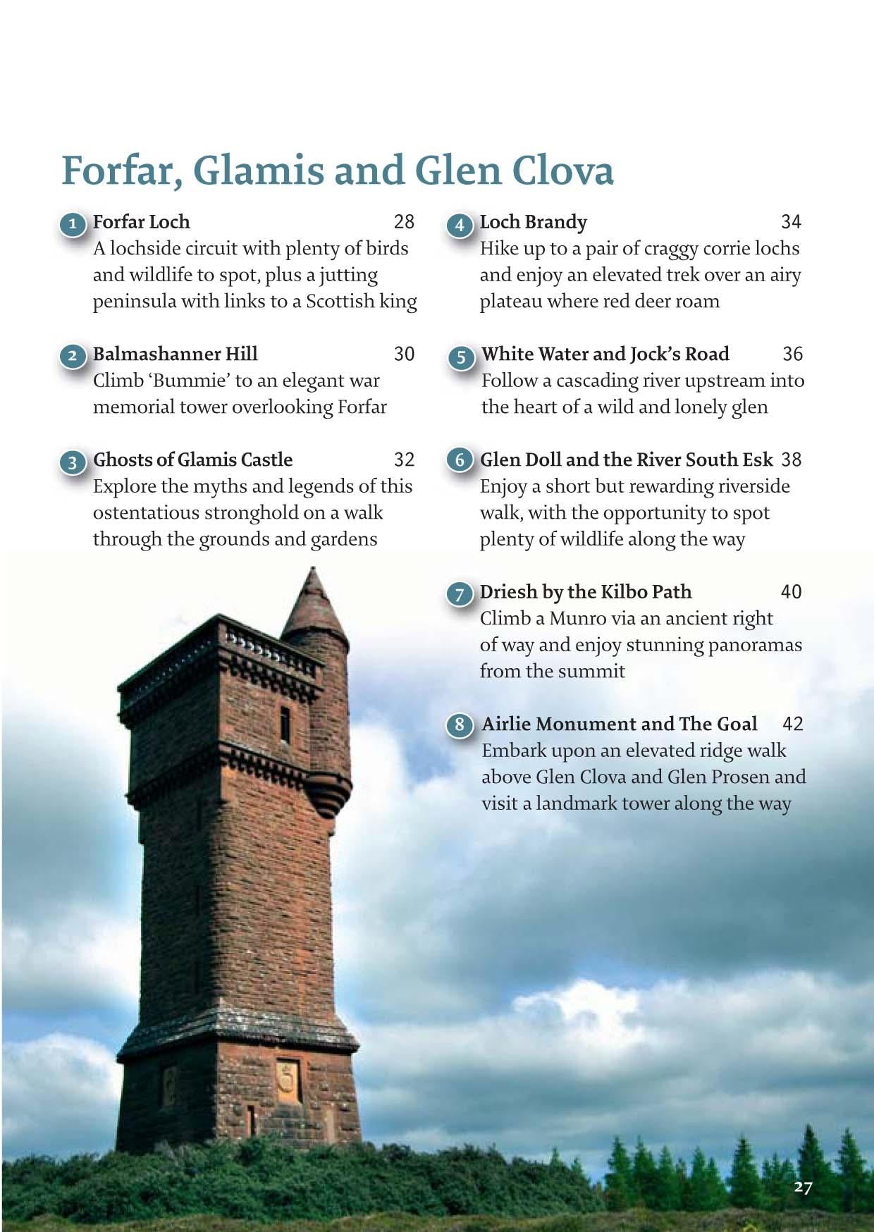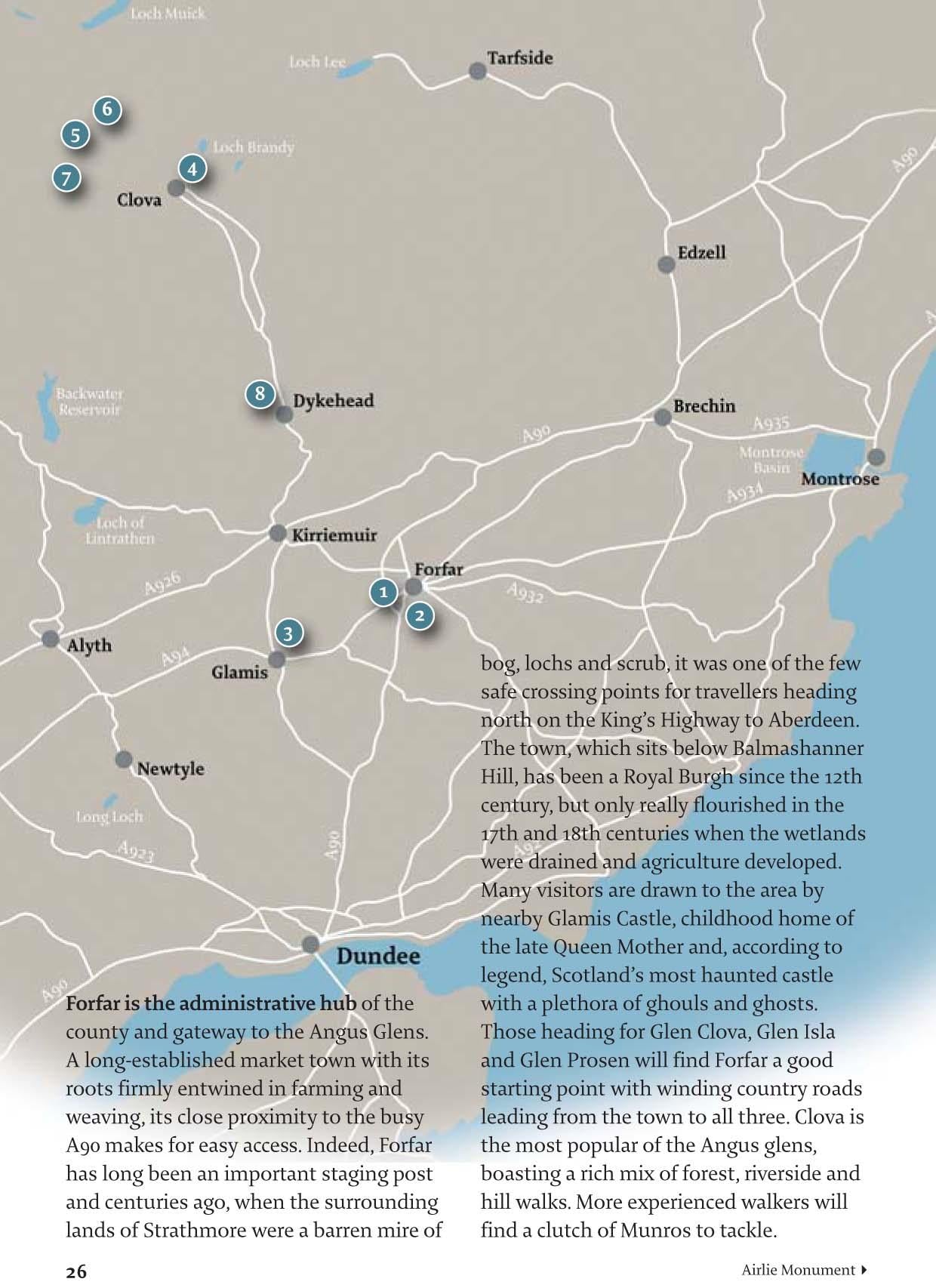 - Angus is the historical heartland of Scotland, a county where the past has left an indelible mark on the present. Prehistoric forts, ancient castles and Pictish standing stones dot a rich and varied landscape where bracing coastal hikes, tranquil riverside rambles, sheltered woodland wanders and more challenging hill ascents await the walker.